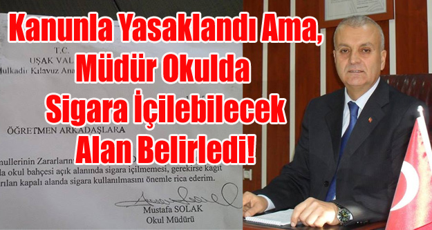 Şehit Abdülkadir Kılavuz Anadolu Lise Müdürü Mustafa Solak kanunla okullarda sigara içilmesi yasaklanmasına rağmen resmi yazı yazarak okul içinde sigara içilebilecek alan belirledi.