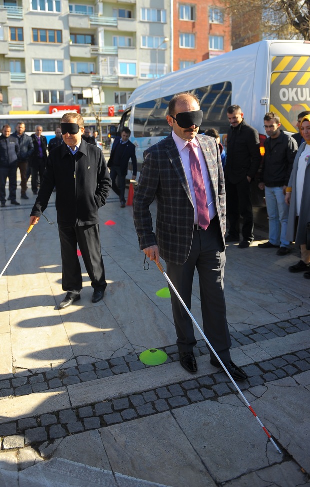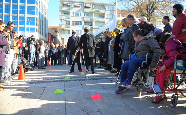 Bazı vatandaşlar tekerlekli sandalyede masa tenisi oynarken bazıları koltuk değneğiyle yürümeye çalıştı, bazıları da "beyaz baston" ile önlerine çıkan engellere rağmen yürümeye çalışırken bazıları da elleri olmadan su içmeye çalışarak engelli deneyimi yaşadı.