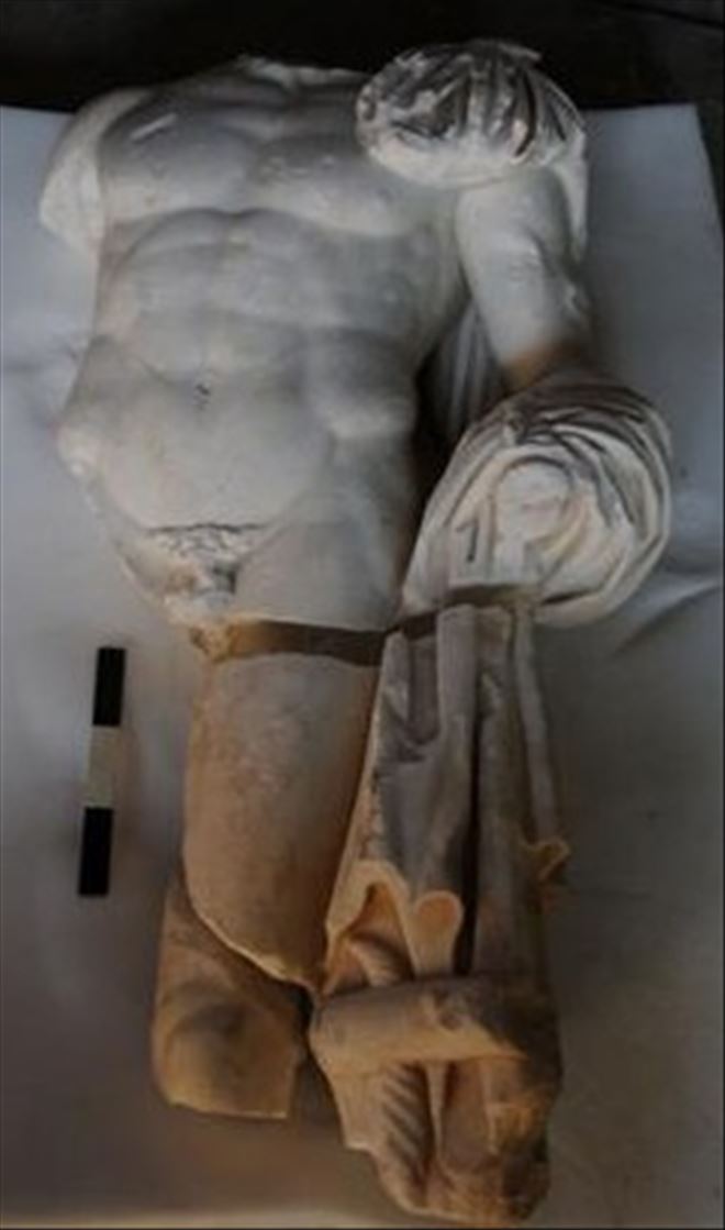Antik Kent’te yer alan Roma Bazilikasında ’Tanrı Apollon’a ait olduğu tahmin edilen, 123 x 68 santimetre ölçülerinde mermer bir heykel bulundu.