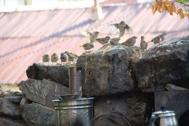 Oltu Kalesi’nin dibindeki babadan kalma evin bahçe duvarına her gün yem dökerek kuşları doyuran Yunus Soylu, kuşları yem yerken izlemenin kendisini çok mutlu ettiğini söyledi.