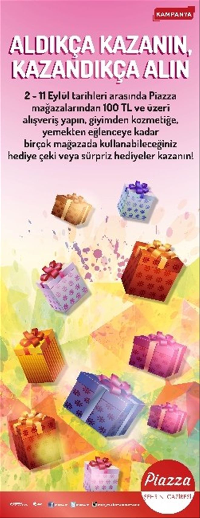 Kahramanmaraş Piazza Alışveriş ve Yaşam Merkezi, 2-11 Eylül tarihleri arasında “Aldıkça Kazan, Kazandıkça Al” kampanyası ile ziyaretçilerine kazançlı fırsatlar sunuyor.