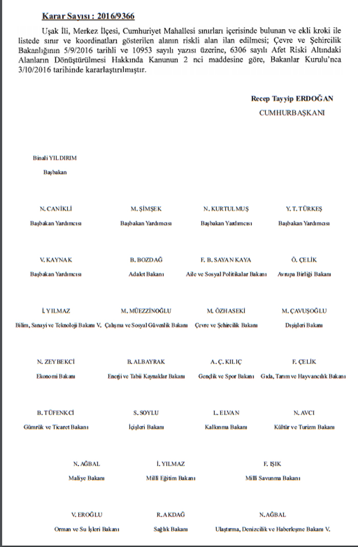 Afet Riski Altındaki Alanların Dönüştürülmesi Bakanlar kurulu VE Başbakan tarafından sonra imzalandıktan sonra, Cumhurbaşkanı Recep Tayyip Erdoğan tarafından da imzalandı ve bugünkü resmi gazetede yayınlandı. Karar SSK Evleri sakinleri tarafınsan şaşkınlıkla karşılanırken özellikle yeni yapılan binalarda oturanlar şok oldu.