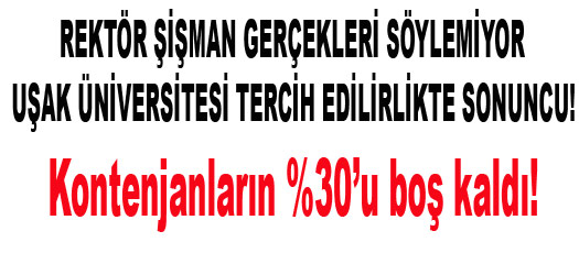 Uşak Üniversitesi Ege Bölgesinde olmasına rağmen yeni bir ilke imzasını attı. Kontenjanların %30’u boş kalan Uşak Üniversitesinin bu durumu başta ilçelerdeki esnaflar olmak üzere şehirde şok yarattı. Boş kontenjan oranları, Uşak üniversitesiyle birlikte açılan Aksaray Üniversitesinde % 18, Giresun Üniversitesinde % 23, Erzincan Üniversitesinde % 21 Çorum Hitit Üniversitesinde % 15 Adıyaman Üniversitesinde %13 oranlarında kalırken Uşak Üniversitesinin % 30 ile hepsini sollaması bölgemiz ve şehrimiz açısından çok üzücü olduğu kadar son derece de düşündürücü bulundu. Gerçek bu iken rektörün fakülte kontenjanlarının dolduğuna dair beyanatı gerçekleri tam olarak yansıtmıyor. Ege Bölgesindeki bir üniversitenin fakültelerinde kontenjanların dolması sürpriz değil. Ancak Ege bölgesindeki bir üniversitede meslek yüksekokullarının kontenjanlarının hemen hemen boş kalması bir skandaldır. Her ne kadar Adnan Şişman meslek Yüksekokullarını üniversitenin bir parçası olarak saymasa ve fakülte kontenjanlarının dolduğunu öne çıkartarak bilgi kirlenmesine yol açsa da toplamda Uşak üniversitesinin kontenjanları %30 olarak boş kaldı. Yalın gerçek budur.