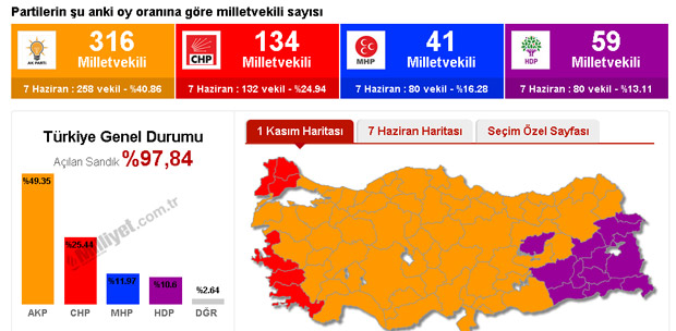 1 Kasım 2015 26. Dönem Milletvekili Seçimi’nden çıkan resmi olmayan sonuçlara göre AK Parti tek başına hükümet kuracak vekil sayısına ulaştı. Resmi olmayan sonuçlara göre açılan sandıkların yüzde 99'u açıldı. Bu sonuçlara göre AK Parti yüzde 49,1 ile 316 milletvekili çıkartıyor. CHP yüzde 25,3'lük oy oranıyla 134 vekile sahip olurken, MHP büyük bir düşüşle yüzde 11,95 oy oranına sahip oldu ve 41 vekile düştü.