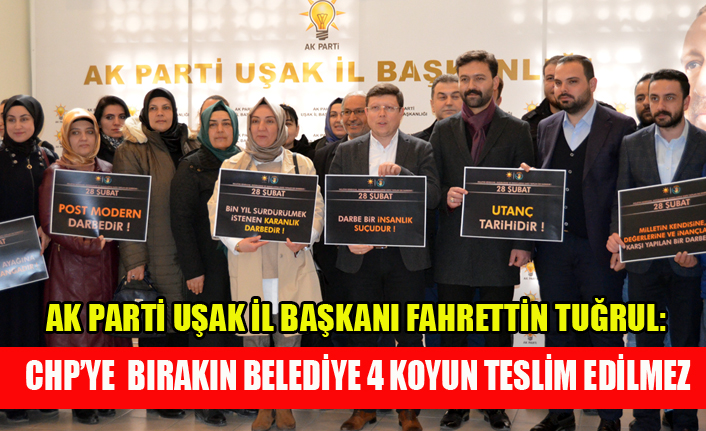 28 Şubat Post Modern darbe girişiminin 22’inci yıldönümü nedeniyle AK Parti Uşak İl binasında bir basın toplantısı düzenleyen AK Parti Uşak İl Başkanı Fahrettin Tuğrul, bu gün Uşak’ta Miting yapacak CHP Genel Başkanı Kemal Kılıçdaroğlu’nu eleştirerek, “Milletimiz, CHP’ye değil belediyeyi, 4 koyunu emanet etmez” dedi.