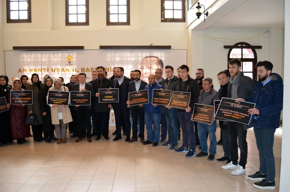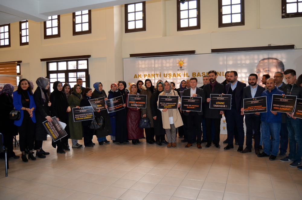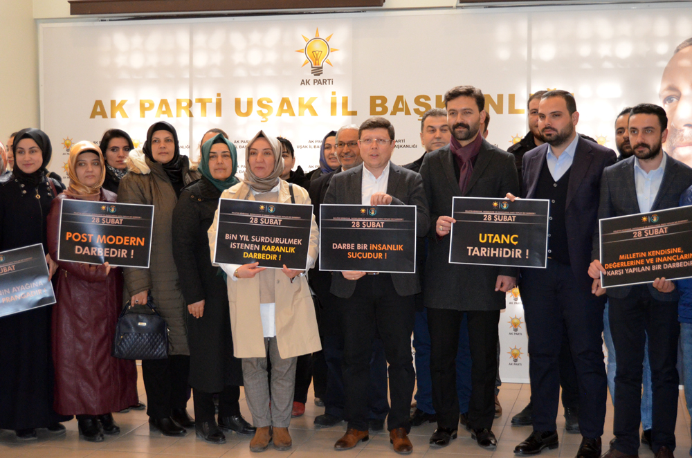 AK Parti Uşak İl Başkanı Fahrettin Tuğrul, 28 Şubat’taki post modern darbe girişiminin 22’inci yıldönümü nedeniyle, AK Parti Uşak il binasında bir basın toplantısı düzenledi. Merkez İlçe Başkanı Mehmet Bayar, İl Kadın Kolları Başkanı İlknur Ertuğrul, İl Gençlik Kolları Başkanı Enes Kale ve parti teşkilatı mensuplarının katıldığı toplantıda darbeler döneminin kapandığını belirten Fahrettin Tuğrul, “Bizler AK Partililer olarak her zaman için devletimizin ve milletimizin yanındayız. O dönemde merhum Erbakan ve hükümete darbe yapılmak istendi. Sokaklara tankları çıkararak, milletin iradesini ezmeye kalktılar ve bu ülkeyi kendi hain ideolojileri ve idealleri doğrultusunda, kendi maşalarını tutan uluslar arası küresel güçlerin emelleri adına, darbe girişiminde bulunmuşlardır. Bu girişim sonunda, 54’üncü hükümete çeşitli manevralarla müdahale etmişler ve millete kabus yaşatmışlardır. Biz bunu torunlarımıza ve çocuklarımıza anlatacağız ve unutturmayacağız. Onlar 28 Şubat’ın bin yıl süreceğini söylemişlerdi. Bu hainliğin millet tarafından fark edilmesi bin yıldan fazla sürecek” dedi.