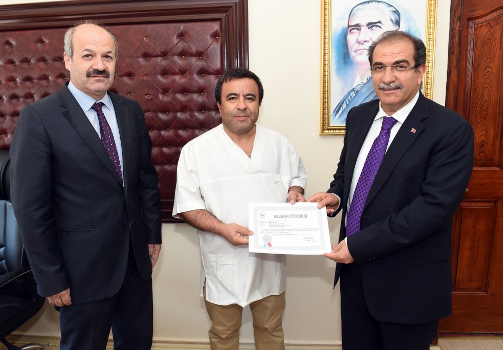 Ödül almaya uygun görülen Uşak Üniversitesi Eğitim ve Araştırma Hastanesi doktorlarından Op. Dr. İsmail Mutafoğlu ve Ebe Zeynep Bozkurt’a belgeleri Vali Salim Demir ve İl Sağlık Müdürü Dr. Sedat kavas tarafından verildi.