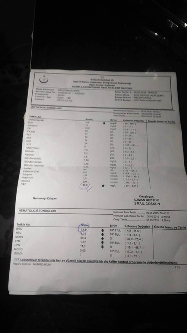 Ben kızım Gülsüm’ü alarak Banaz Devlet hastanesine gittim. Çocuk doktorunu buldum ve tahlilleri gösterdim. Tahlillere bakan doktor da bu sonuçların çok kötü olduğunu ve kızımı gerekirse üniversite hastanesine bile sevk edebileceklerini belirterek Uşak’ta nöbetçi olduğunu ve kızımı Uşak Devlet Hastanesine getirmemi söyledi. Bunun üzerine çok hızlı bir şekilde panik halinde kızımı Uşak’a getirdim. Uşak’ta tahliller yapıldığında kızımın hiçbir şeyi olmadığı söylendi ve ilaç bile yazılmadı. Bu sonuçlar çıkana kadar yaşadıklarımızı bir biz biliyoruz birde Allah biliyor. Kızımın kötü bir rahatsızlığı olmasından çok korktuk. Nasıl oluyor da Banaz da yapılan tahliller yanlış çıkıyor. Yetkilere bu konuda bir an önce önlem almalı. Dava açmayı bile düşünüyorum” dedi.